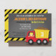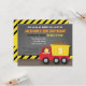Esta invitación linda y colorida del tema de la construcción tiene un pequeño muchacho lindo del constructor en un gorra de seguridad y un chaleco anaranjado que conducen un camión volquete rojo. El diseño se trata con un efecto de sombra que añada un estallido al diseño. Un modelo inclinado amarillo y negro de las rayas que se utiliza para las zonas y las barreras de la construcción. ¡Grande para los muchachos del cumpleaños que aman los vehículos de la construcción y los juguetes del camión! Personalice fácilmente con los detalles del fiesta.