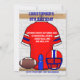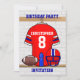 El diseño blanco y azul rojo adaptable del jersey del hierro de la rejilla del fútbol apenas añade su nombre y número para crear una invitación adaptable única de la fiesta de cumpleaños del fútbol del hierro de la rejilla.