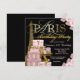 Invitación de cumpleaños de París con una hermosa Torre Eiffel dorada, elegantes paquetes de regalo de París, zapatos de tacón alto con brillo dorado y elegante letra dorada de París sobre un fondo floral rosa intenso y negro. Esta hermosa invitación de cumpleaños de París se personaliza fácilmente para su evento simplemente agregando sus datos en el estilo de letra y color, y redacción de su elección. Este es un diseño impreso sin diamantes reales, joyas, brillo, etc.