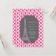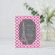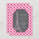 Invitación moderna de cumpleaños para chicas, adolescentes y mujeres jóvenes. En el fondo, el color rosa y blanco es claro, con una etiqueta gris oscuro y una torre de estilo iffel rosa.