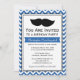 Una invitación a la fiesta de cumpleaños con motivos de bigote y chevron en azul real, negro y blanco para los hipsters que el corazón apesta!