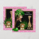 Tarjetas de invitación a la fiesta de cumpleaños con tema de safari de la selva rosa con mono, jirafa, rana y león lindos. Esta adorable invitación para la fiesta de cumpleaños de safari de la selva para niñas se personaliza fácilmente para su evento agregando los detalles del evento, el estilo de fuente, el tamaño y el color de la fuente y la redacción. Algunos gráficos gráficos ©delightful-doodles.