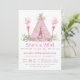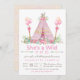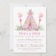 Chicas invitan a una fiesta de primer cumpleaños con tepe y globos tribales rústicos rosados sobre un fondo de flecha de bonito floral y tribal con fondo tribal de acuarela rosa en la parte trasera. Estas invitaciones para fiestas tribales salvajes de un primer cumpleaños se personalizan fácilmente para tu evento simplemente agregando tus detalles.