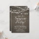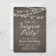 Celebre su día especial con esta invitación de fiesta sorpresa rústica. Este diseño presenta una tipografía de letra cursiva elegante y luces de cuerda sobre un fondo de madera rústica. Perfecto para una fiesta de jardín, fiesta de granero o cualquier fiesta sorpresa.