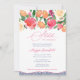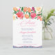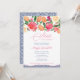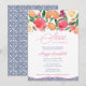 Invite a los invitados a una fiesta sorpresa que celebra el cumpleaños de una querida señora. Quería que este diseño evocara sentimientos de una cálida tarde de verano con el aire perfumado por flores locales. Este diseño de invitación femenino y llamativo presenta flores vibrantes de acuarela rosa y detalles audaces de frutas cítricas, complementados por un patrón de baldosas azul oscuro y blanco en la base de la invitación frontal y en el reverso.