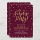 Celebra tu día especial con esta elegante plantilla de invitación de cumpleaños sorpresa moderna. Este diseño presenta confeti texturizado dorado y caligrafía con un fondo rojo burgundy. Puedes personalizarlo para cualquier edad o evento.