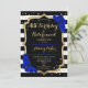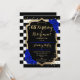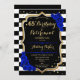 Invitación de Fiesta de Cumpleaños y Jubilación. Diseño elegante en negro, dorado y azul real. Cuenta con rayas negras y blancas, fuente de letra con estilo, brillo dorado falso y confeti. Perfecto para una celebración conjunta de cumpleaños y jubilación glamorosa. Personalice con sus propios detalles.
