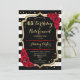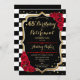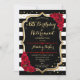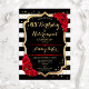 Invitación a la fiesta de cumpleaños y jubilación. Diseño elegante en negro, dorado y rojo. Características rayas blancas y negras, fuente de escritura con estilo, brillo falso dorado y confeti. Perfecto para una celebración conjunta de cumpleaños y jubilación glamorosa. Personalice con sus propios detalles.
