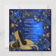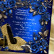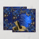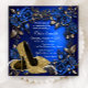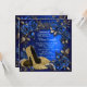 Invitación de cumpleaños azul real y dorado con hermosos zapatos de tacón alto con purpurina dorada y perlas, remolinos dorados sobre un hermoso fondo floral azul y dorado. Esta elegante invitación de cumpleaños azul y dorada se personaliza fácilmente para su evento simplemente agregando sus detalles en el estilo de letra y color, redacción y diseño de su elección.
