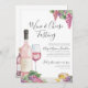 Invitación elegante de acuarela para degustación de vino y queso. Un adorable tema de degustación de vino y queso de tonos rosa y púrpura perfecto para una fiesta de inauguración, cumpleaños, fiesta de compromiso de parejas, noche de chicas o simplemente por el amor al vino. Completo con botellas de vino rosa de acuarela, y copas de vino, un poco de queso amarillo, y luego uvas adorables en rosa y púrpura y por supuesto hojas de parra verdes.