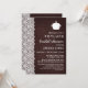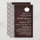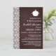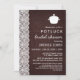 Invitación para una fiesta de despedida de soltera con compartir de comida con un fondo impreso de arpillera y encaje, y una olla con tapa con un pomo en forma de corazón.