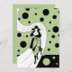Diseño de ilustración vintage art déco con una dama elegante vestida con sombrero y abrigo y llevando un bolso. La mujer camina por una pasarela flotante. Lunares negros, círculos o burbujas flotan alrededor.