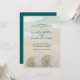Invitaciones de desayuno nupcial para la pareja, o fiesta de compromiso, con un fondo de playa y diseño de dos dólares de arena. Personalice el texto en tres lugares con nombres en una fuente de escritura más grande. Todo el texto es azul verdoso y el fondo es agua de mar azul claro y arena de playa. Dos grandes dólares de arena con forma de cerradura, en su estado natural, representan a la pareja que ama la playa y asoman desde la parte inferior de la tarjeta.