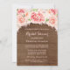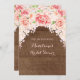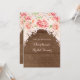 Invitaciones personalizadas para la fiesta de despedida de soltera con un patrón rústico de madera marrón y hermosas flores vintage de acuarela en rosa pastel claro.