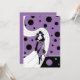 Diseño de ilustración vintage art déco que presenta a una dama chic vestida con sombrero y abrigo y llevando un bolso. La mujer camina por una pasarela flotante. Lunares negros, círculos o burbujas flotan alrededor.