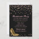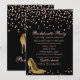 Invitación de despedida de soltera glamurosa en negro, con gráficos de confeti de tono rosa y dorado y zapatos de tacón alto dorados. Personalice el texto personalizado rosa según sus necesidades.