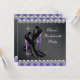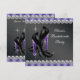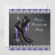Invitación de fiesta de despedida de soltera elegante con zapatos de tacón alto y diamantes de leopardo negro y morado. Esta hermosa invitación de fiesta de despedida de soltera en negro y morado se personaliza fácilmente para su evento. Tenga en cuenta que todas las pegatinas, tarjetas y diseños de invitaciones que encontrará en Zazzle son gráficos impresos sin joyas reales, lazos, relieves, grabados ni piezas o partes añadidas.