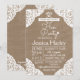 Crea el escenario para una noche sofisticada y memorable con estas invitaciones de despedida de soltera rústicas de arpillera y encaje blanco vintage. Perfectas para la novia que ama una mezcla de encanto rústico y elegancia vintage, este diseño presenta un fondo de efecto de arpillera de alta resolución acentuado con delicadas esquinas de encaje blanco intrincado. La tipografía blanca crujiente proporciona un aspecto limpio y contemporáneo, lo que facilita a los invitados leer todos los detalles de la fiesta, desde el lugar hasta la confirmación de asistencia. Ya sea que estés planeando una noche elegante en un bar de cócteles, una fiesta en el jardín o una "última aventura" trendy en la ciudad, esta invitación versátil se adapta a una variedad de temas de fiesta de despedida de soltera.