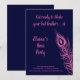 Una gran pluma de pavo real en fucsia adorna esta Invitación de Despedida de Soltera sobre un fondo azul marino con el dicho adorable, ¡Prepárate para agitar tus plumas! haciéndolo perfecto para una noche en la ciudad bailando para celebrar a la novia.