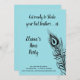 Una gran pluma de pavo real decora esta Invitación de Despedida de Soltera sobre un fondo azul turquesa con el dicho adorable, ¡Prepárate para Agitar tus Plumas de Cola! haciéndolo perfecto para una noche en la ciudad bailando para celebrar a la novia.
