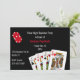 Invitación de fiesta de despedida de soltero con tema de póquer hecha en negro con gráficos de cartas y fichas de póquer. Personalice el texto blanco y rojo personalizado para adaptarlo a las necesidades de su fiesta de póquer.
