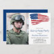 Invitaciones de fiesta de despedida para soldado con bandera estadounidense. Estas invitaciones de fiesta con bandera estadounidense modernas son perfectas para una fiesta de despedida de un soldado, despedida de despliegues militares, celebración de bienvenida a casa de militares, graduación militar y jubilaciones militares. Personalice esta invitación de bandera estadounidense con la foto de su soldado, evento, nombre y detalles de la fiesta.