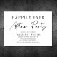 Invitación minimalista y chic en negro y blanco para la fiesta de después de boda para una celebración post fuga o boda. "Fiesta Feliz para Siempre" está escrito en una mezcla de tipografía simple y una elegante letra moderna.