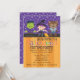 Estrellas púrpura en el fondo, rayas naranjas en la parte inferior y personajes Frankenstein, bruja y lobo ilustran esta genial invitación a la fiesta de Halloween. Se lee "estás invitado a un fiesta de disfraces de Halloween".