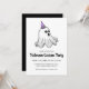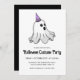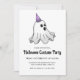 El pequeño fantasma con su gorra fiesta morado está listo para un maravilloso fiesta de disfraces de Halloween.
