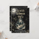 Invitación a la fiesta de disfraces de Halloween en la casa de brujas gótica. Esta tarjeta de invitación presenta un diseño gótico oscuro con un fondo negro polvoriento. Los acentos ornamentos rústicos ornados enmarcan la carta, mientras que el título del evento, "Fiesta de Halloween embrujada", se muestra en un inquietante guion gótico dorado. La sutil imagen de una bruja espeluznante que mezcla su mágica poción con una luna llena realza el ambiente espeluznante, invitando a los huéspedes a una noche de encuentros espeluznantes.