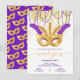 Invitaciones modernas de fiesta de disfraces de Mardi Gras doradas y púrpuras. Características una máscara dorada con plumas, cuentas colgantes y fondo de confeti dorado. Dorado falso.