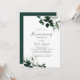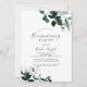 Esta invitación a una fiesta de bienvenida esmeralda es perfecta para un evento de boho. El diseño es elegante y rústico, con unas hojas de acuarela verde oscuro y un eucalipto con un toque bohemio moderno.