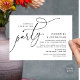Anuncia y comparte tu felicidad para siempre con estilo con el diseño de nuestra tarjeta de invitación de tema negro y blanco moderno (Fiesta de felicidad para siempre) para una cena de boda íntima, almuerzo, brunch o celebración. Es ideal para parejas que han decidido celebrar su mejor día. Con su diseño sofisticado y juguetón, esta invitación seguramente establecerá el tono para un evento inolvidable. La tarjeta de invitación presenta un tema de diseño de letra moderno y minimalista, agregando un toque de elegancia atemporal a tu celebración. Diseñado por TeeshaDerrick