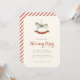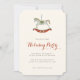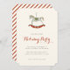 Invitación festiva navideña con un mecedor ornamento navideño de caballo, tipografía de escritura caprichosa y un respaldo a rayas en rojo, perfecto para una fiesta ecuestre de feriados, fiesta de Navidades de granero o cualquier otra celebración navideña. Personalizable completo de la plantilla de texto para que se ajuste a su evento!