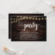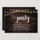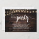 Hermosa fiesta Felices para Siempre, tarjeta de anuncio / invitación de fuga de novios, en madera oscura de cabaña rústica, diseño de luces de cuerda. Esto es perfecto para la recepción de su boda y la fiesta de celebración después de la boda.