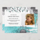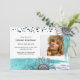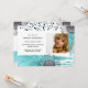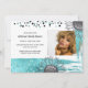Un fondo blanco y agudo tiene dibujos de girasol gris oscuro en las esquinas superiores y uno a lo largo del borde inferior situado en el centro. Cada flor tiene un centro plateado con un Relieve metalizado de agua azul acuática vibrante que chisporrotean detrás de ellos, lo que la hace pop. Una plantilla de fotos en color con un borde falso de borde plateado se coloca en la mitad central derecha y se encuentra junto a las plantillas para su redacción personalizada. El diseño posterior es una copia de la parte delantera y la plantilla de tipo de letra negro puede utilizarse para agregar información adicional o puede eliminarse si no es necesario. Cambie el color de fondo a cualquiera de sus opciones. Ideal para cumpleaños, aniversario, boda, fiestas de soltero y soltera, así como duchas de novias.