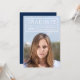 Moderna invitación para una fiesta de graduación con los detalles del graduado dentro de una cuadrícula de blanco en el frente. La tarjeta tiene un color de fondo modificable (haga clic en personalizar para cambiarla) en el reverso. Personalízalo reemplazando el texto del marcador de posición y reemplace la foto de ejemplo/marcador de posición con su propia foto. Para obtener más opciones, como cambiar el tipo de letra y su tamaño/color o el espaciado entre letras, haga clic en el botón "Personalizar". *Tenga en cuenta que la marca de agua Zazzle que aparece en la vista previa del zoom NO aparecerá en el producto impreso final. © Rosewood y Citrus