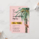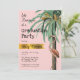 Rubor rosa con palmera vintage y diseño flamingo invitación de la fiesta tropical de graduación de Holiday Hearts Designs. La parte posterior presenta un degradado de tono dorado que se refleja en un patrón de confeti de aspecto falso purpurina sobre el fondo rosado de color. El conjunto es divertido y caprichoso.