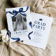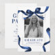 Celebre el logro de su graduado con nuestras invitaciones de fiesta de graduación sencillas y elegantes. Cada tarjeta cuenta con un fondo blanco llamativo, adornado con una foto de su graduado enmarcada por un lazo y cinta de acuarela azul de moda. Voltee para ver la información de la fiesta que es fácil de personalizar.