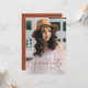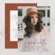 Invite a los invitados a celebrar la graduación con nuestras elegantes invitaciones de graduación con foto. Las invitaciones de graduación presentan la foto vertical del graduado con "Graduado" en una superposición de escritura en caligrafía moderna de color marrón terracota. Personalice el frente de la invitación de graduación moderna agregando el nombre del graduado, el nombre de la escuela y el año de graduación. La invitación se revierte para mostrar los detalles de su fiesta de graduación y un patrón geométrico de puntos marrón y blanco de moda.