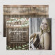 Invitaciones de fiesta de graduación rústicas con fondo de barril de roble de granja, una foto del graduado, luces de hadas, vegetación elegante en acuarela, el año de graduación y texto moderno en blanco.
