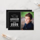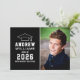 Anuncia a tu graduado de secundaria o universidad con estilo con esta invitación de graduación y fiesta. Tarjeta de dos caras con un retrato del graduado con gorro de graduación y un diseño de tipografía blanca simple y moderna. El fondo negro se puede cambiar a un color diferente con la función "Personalizar", luego Editar / Fondo para seleccionar otro color.