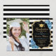 Invitación a una fiesta de graduación con tu foto. Presenta rayas blancas negras, letra de guión, rosas turquesa, tassel y confetti. Elegante diseño azul acuático blanco negro con oro falso purpurina. Perfecto para una celebración elegante.