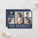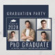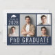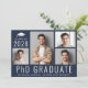 Invitación moderna de graduación de doctorado de PhD de color azul oscuro y tarjeta de invitación a la fiesta con un collage de 4 fotos, "Graduado de PhD" escrito en la parte inferior en letras mayúsculas blancas grandes y su año de graduación, nombre y universidad o facultad en tipografía blanca simple. En el reverso, agregue los detalles de la fiesta.