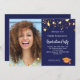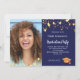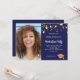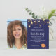 Añade tu propia foto de tamaño vertical del graduado. Color de fondo azul marino de moda, decorado con estrellas de oro falsas. Personalice y agregue un nombre y detalles del fiesta. Cartas doradas.