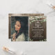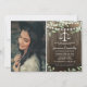 Invitaciones de fiesta de graduación de derecho de campo rústico con fondo de madera, foto del graduado, vegetación elegante de acuarela, luces de cuerda, balanza de la justicia y una plantilla de texto moderna fácil de personalizar.