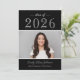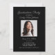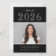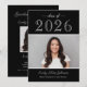 Invitación moderna de fiesta de graduación que presenta “Clase de 2026” en elegante letra cursiva con un diseño negro atrevido y detalles de acento plateado. Personalice con el nombre del graduado y la escuela para un look limpio y atemporal. La parte posterior presenta un diseño negro coordinado con el texto “Fiesta de Graduación” y una foto enmarcada. Perfecto para una fiesta de graduación o celebración de puertas abiertas.