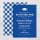 Invite a amigos y familiares con esta invitación de fiesta de graduación azul que presenta un titular destacado de “Backyard BBQ”, un icono de gorra de graduación y tipografía rústica limpia. Perfecto para una parrillada casual, casa abierta o celebración de verano en el patio trasero. La parte trasera presenta un patrón de gingham azul real y blanco coordinado para un ambiente clásico de picnic. Personalice con el nombre de su graduado y los detalles de la fiesta.