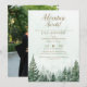 Esta elegante invitación rústica de 'la aventura espera' con acuarela de bosque de pino para la fiesta de graduación se puede personalizar con su información en tipografía moderna y una foto especial en el reverso. Diseñado por Thisisnotme©