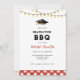 Invitación divertida y rústica a la fiesta de graduación con barbacoa con ilustración de acuarela de gorra de graduación y luces de cuerda con cuadros de gingham rojos y blancos en la parte inferior.